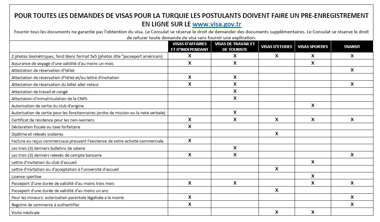 - L’Ambassade de la République de Turquie à Abidjan porte à votre aimable connaissance que les postulants du visa turc doivent faire le pré-enregistrement en-ligne sur le site webwww.konsolosluk.gov.tr.